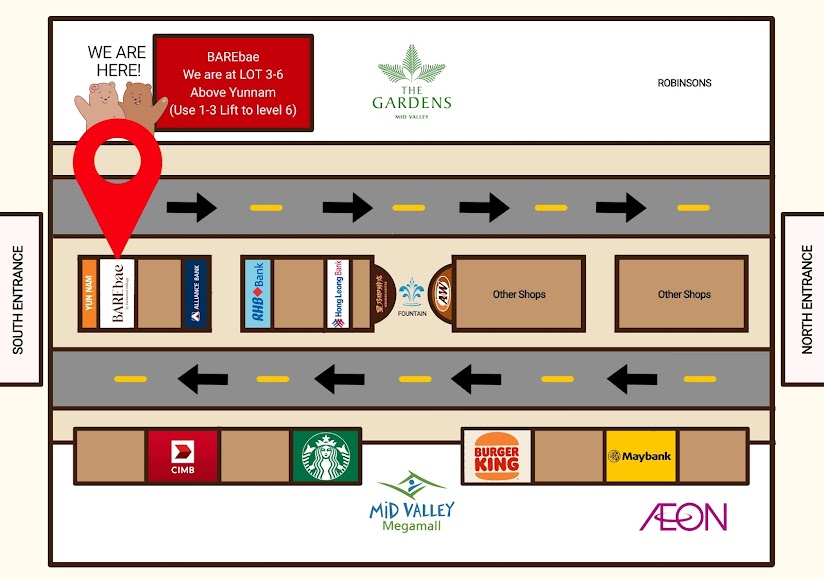 In between the Garden mall and Midvalley, there is a water fountain. Beside fountain, one side is A&W, another side is Hoshino coffee. Just go to Hoshino coffee side to the end, you will see YUNNAM . Use lift 1-3 and come up to level 6 😊